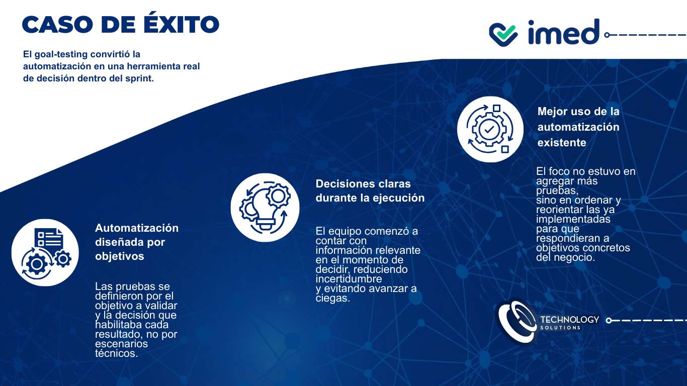 Desde Technology Solutions acompañamos en la adopción de un modelo de goal-testing, redefiniendo la automatización a partir de una pregunta clave: qué objetivo se quiere validar y qué decisión habilita cada prueba.